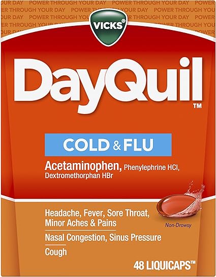 Amazon Com Vicks Dayquil Liquicaps Cough Cold Flu Relief Sore Throat Fever Congestion Relief Non Drowsy 48 Liquicaps Health Personal Care
